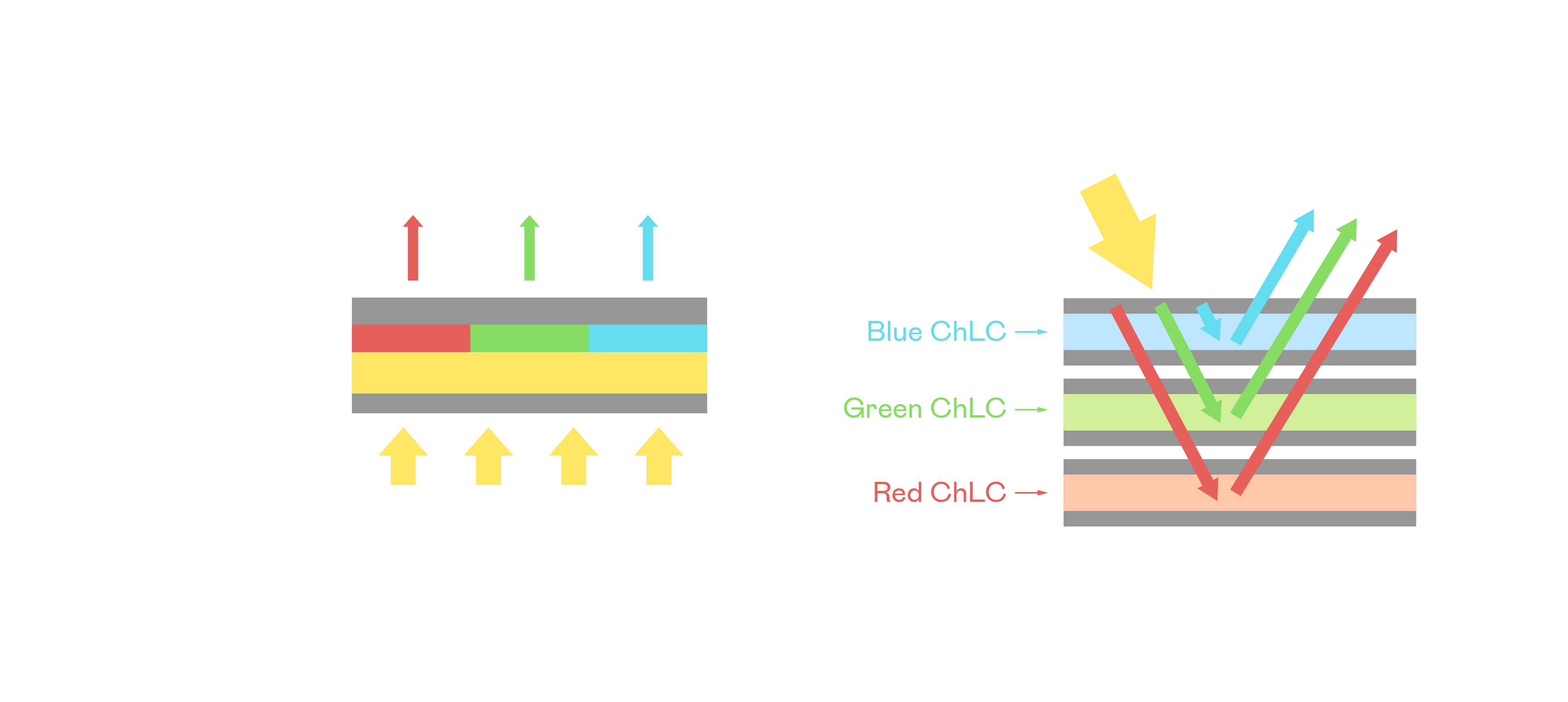stake膽固醇液晶顯示器是由紅、綠、藍三層膽固醇液晶面板堆疊而成,並採用無彩色濾光片設計,減少環境光在反射過程中的損耗。
